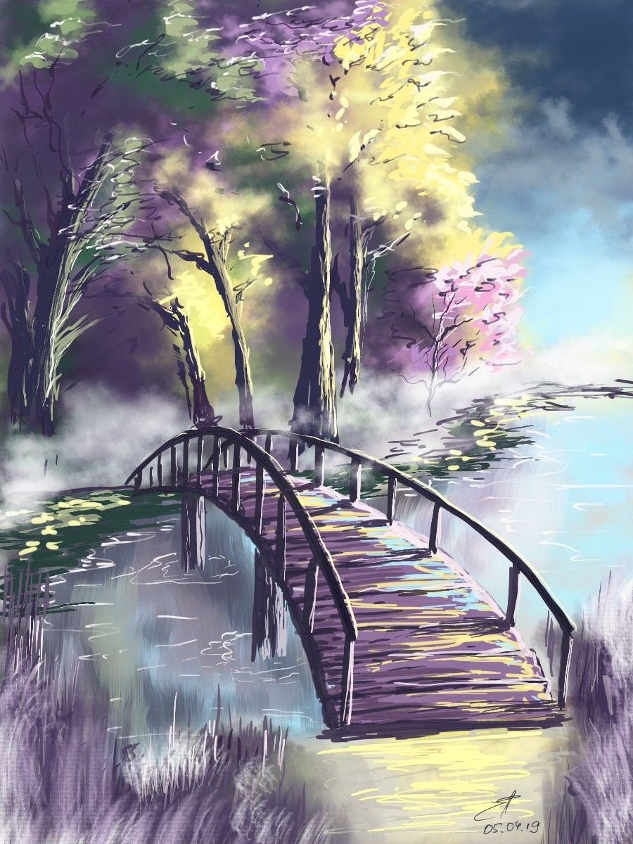 Мост лежал перед ним — узкий, ненадёжный. Под ним колыхалась забудь-трава, шептала что-то беззвучно. Герой глубоко вздохнул и ступил на первую доску. Она скрипнула, но выдержала.