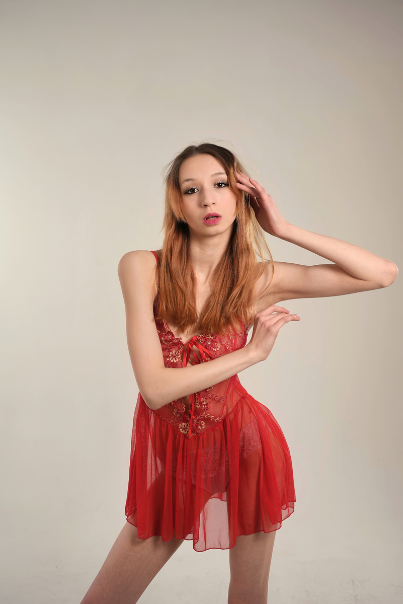 Иногда достаточно одного цвета и одного взгляда, чтобы построить целую историю. Студийная фотосессия с Алёной Ц. — как раз из таких: минимализм пространства и максимум внимания к деталям образа, жестам и настроению. Алёна предстаёт в лёгком алом платье из полупрозрачной ткани, напоминающем воздушный пеньюар. Тонкая сетка мягко движется вместе с её телом, создавая ощущение невесомости. Декоративная вышивка на лифе добавляет изящества и тонкой фактуры, а силуэт подчёркивает хрупкость фигуры. Образ дополняют лаконичные бежевые туфли на высоком каблуке — спокойный акцент, который не спорит с главным цветом съёмки. Внешность модели — деликатная и утончённая. Светлая кожа, мягкие черты лица, выразительные глаза. Волосы — прямые, с лёгкой естественной текстурой, оттенок уходит в тёплый русый с медными нотами. Причёска не перегружена укладкой: волосы свободно ложатся на плечи, иногда слегка растрёпаны, что добавляет образу живости и естественности. Макияж выполнен в нюдовой гамме. Лёгкий тон,
