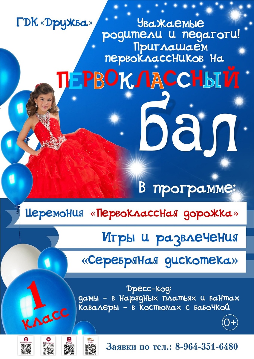 ! Первоклассный бал — это важное и волнующее событие, которое требует тщательной организации и профессионального подхода. Дворец культуры «Дружба» гарантирует высокий уровень мероприятия! Для первоклассников мы подготовили яркую программу, которая включает в себя стильную церемонию «Первоклассная дорожка», игры и развлечения для взрослых и детей, серебряную дискотеку. Обязательный дресс-код: дамы - в нарядных платьях и бантах, кавалеры - в костюмах с бабочками! С удовольствием встретимся с вами, чтобы обсудить все детали и сделать Бал первоклассников поистине особенным! Тел. 89643516480.