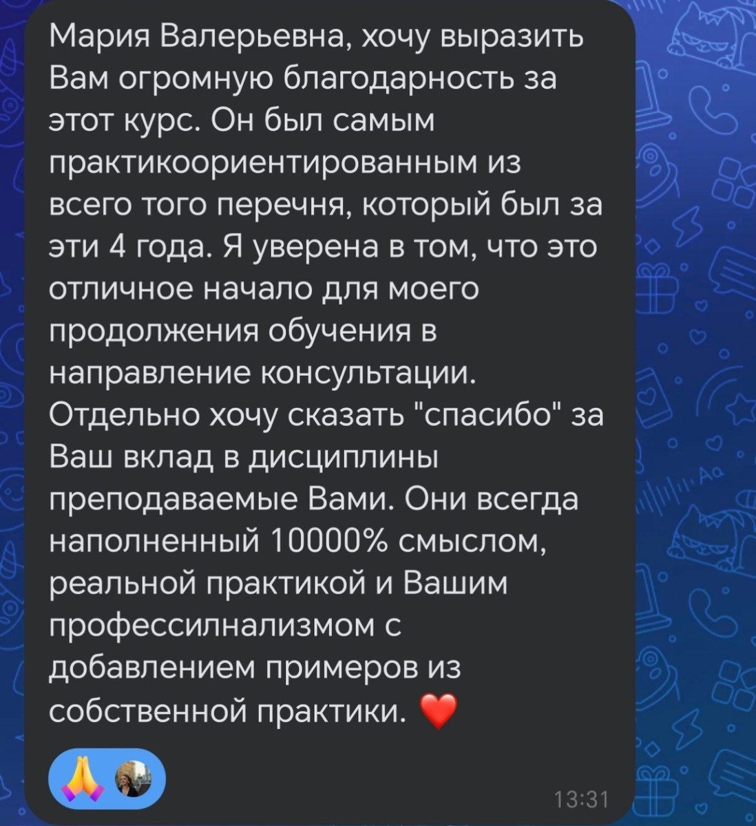 Хочу поделиться ценным отзывом, который получила в конце курса от одной очень ответственной студентки 🧡 А также феноменальной работой с книгой, которую продемонстрировал один из наших студентов✨. Хотя, честно говоря, главная цель этого поста — напомнить о проекте бесплатной психологической поддержки «Доверительная беседа», который я создала почти год назад. Но по порядку. У меня завершился очередной курс «Тренинг профессионального мастерства» для студентов-психологов в Петербургском государственном университете путей сообщения. Он появился три года назад, когда нужно было закрыть новые компетенции из обновлённого ФГОС по психологии. Я очень рада, что вести его доверили именно мне. Наполнение курса полностью зависело от меня, и я решила уделить особое внимание такому важному аспекту, как ведение терапевтической (или доверительной) беседы. Курс консультирования в программе, конечно, есть, но мне хотелось сделать акцент на практике и помочь студентам понять: создание доверительной атмос
