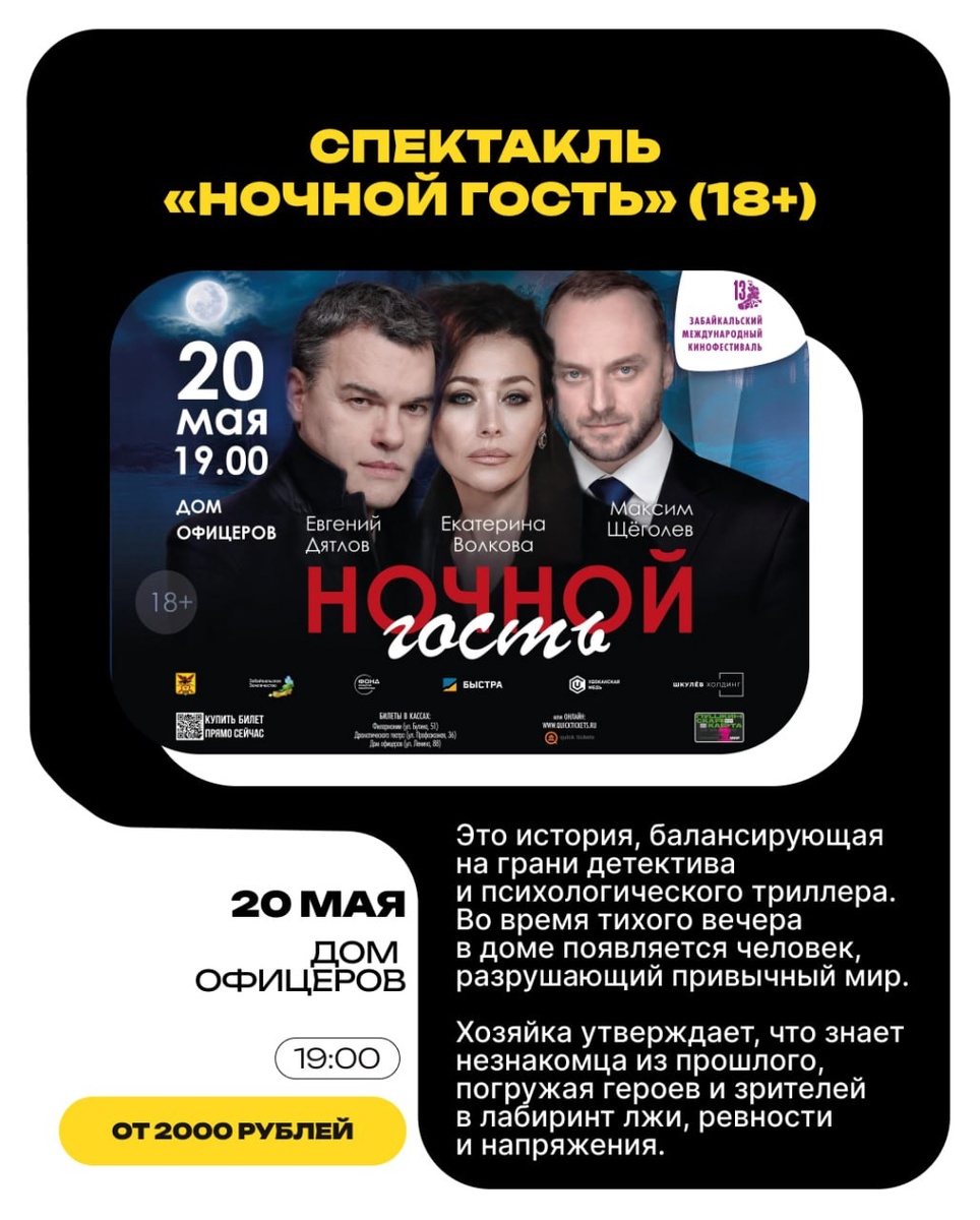 Спектакль «Ночной гость» (18+) соберет звезд на сцене в Чите перед Забайкальским международным кинофестивалем