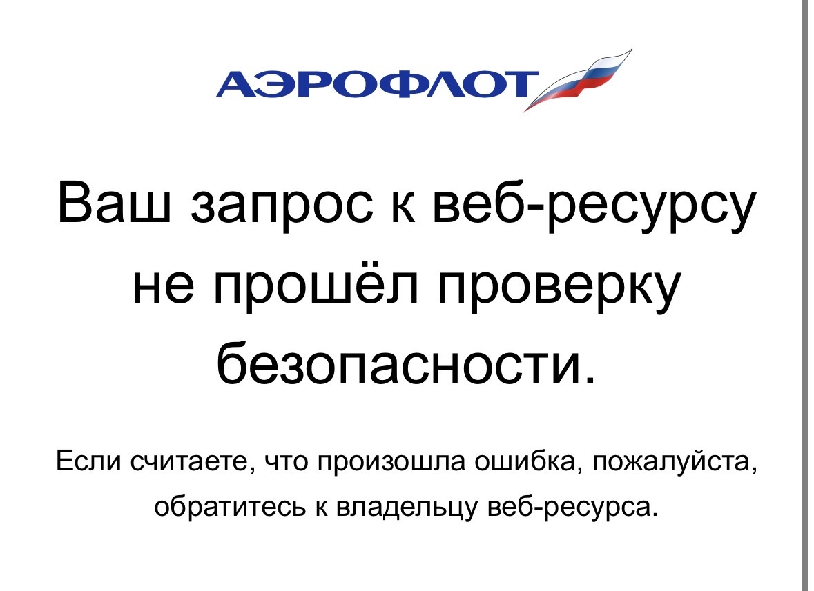 А вот Аэрофлот пока работает: он часто в принципе выдает ошибку (особенно в мобильном приложении), указывая «Ваш запрос к веб-ресурсу не прошел проверку безопасности» и как бы блокируя доступ, это бывает и в России и за границей и решается просто перезагрузкой данной страницы (сразу проверка безопасности оказывается пройденной без всяких дополнительных танцев с бубнами).
