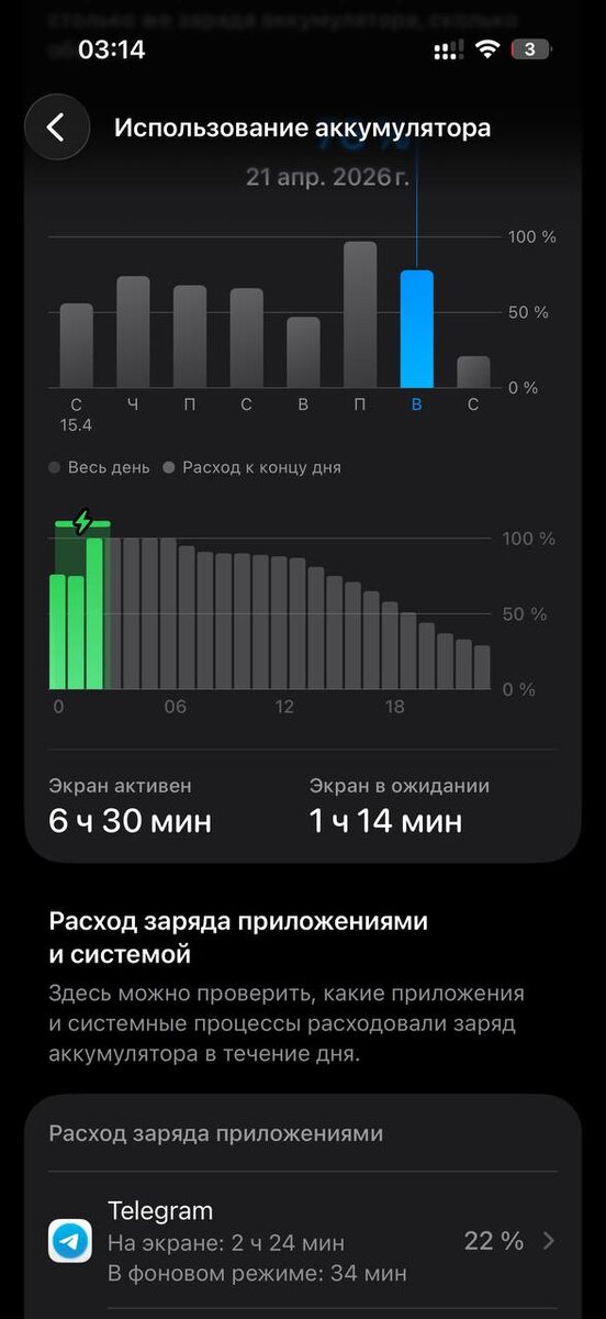 ⚡️Автономность iOS 26.5 Beta 3 Снял с зарядки в 03:14 и активно пользовался до 08:00 утра, а потом с 15:00. В итоге в 03:14 оставалось 3%. По условиям все стандартно для меня: LTE на двух симках, вайфай/сотовая сеть 50/50 по времени. Яркость 50%. Как обычно соцсети, браузер, ютуб, навигация. Айфон 17 Про, емкость аккума 100%. Always On и 120гц включены. В итоге чуть более 7,5 часов экрана. Примерно, как на прошлой бете. Как у вас?🤔