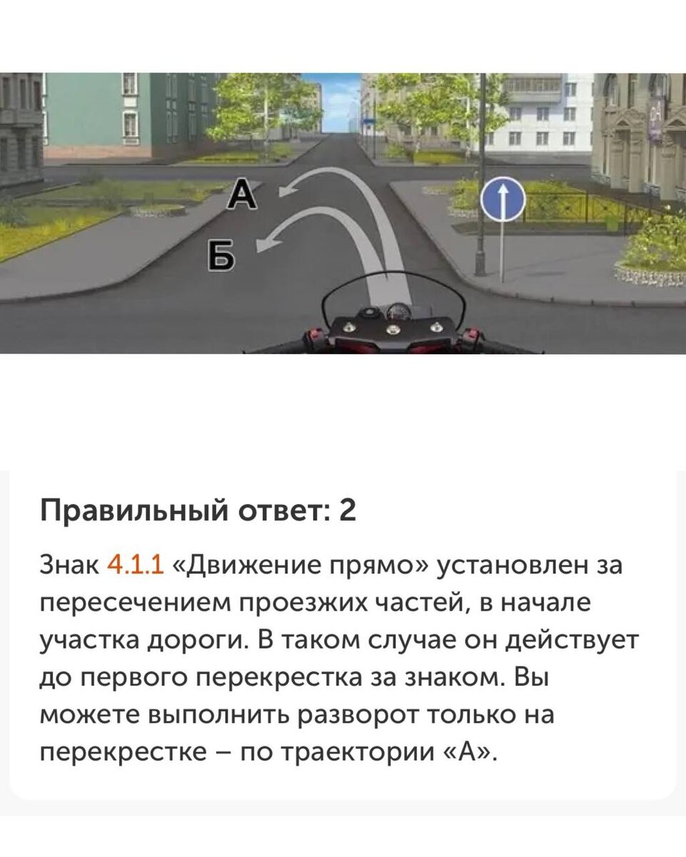 ! Пятерка тому, кто ответил - только по траектории А. Знак 4.1.1 «Движение прямо» установлен за пересечением проезжих частей, в начале участка дороги. В таком случае он действует до первого перекрестка за знаком. Вы можете выполнить разворот только на перекрестке - по траектории «А». Понравился формат? Делаем такую рубрику на постоянной основе?