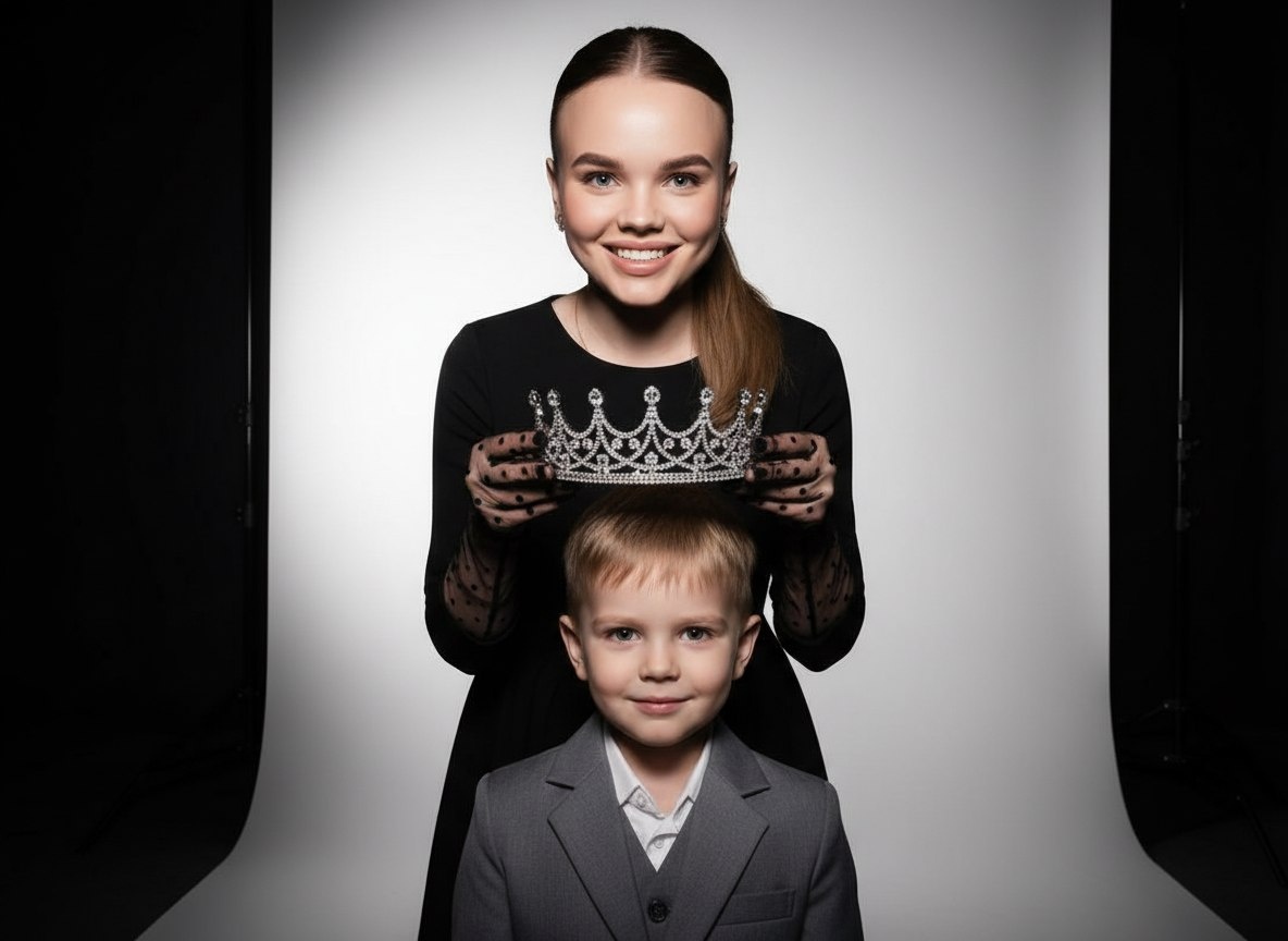 Женщина стоит чуть выше в кадре, мягко улыбаясь и держа серебряную корону с белыми бриллиантами, прямо над головой ребенка, в момент ее надевания – корона еще не надета на голову\. Женщина одета в черное платье\. У женщины черные, прозрачные перчатки в горох\. Зубы у женщины белые, натуральные, красивые\.