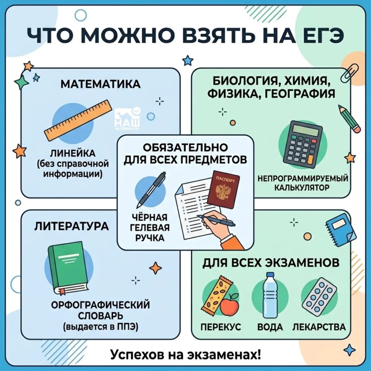 ❗Среди них — калькулятор, линейка, словарь, вода, перекус и лекарства. А также черная гелевая ручка и паспорт.