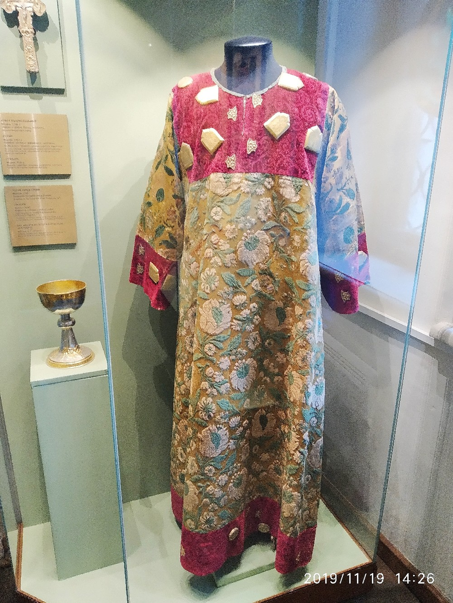 Я условно назвала "лоскутным" облачение, потому что буквально состоит из кусков ткани. Драгоценная иностранная ткань, с золотным шитьём. Парча, бархат. Каждый лоскуток берегли , даже мелкие куски собирали. Стихарь — богослужебное облачение церковнослужителей (низших клириков) в православной церкви. Храм Василия Блаженного, Красная площадь, Москва. 2019 год. Когда увидела это облачение, то заметила, что детали состоят из мелких кусков, как будто лоскутные. Это меня тогда потрясло и удивило. — Ну, я бы такое не назвала лоскутным. Лоскутное шитьё из кусков от разной ткани, разных цветов. А здесь это одна и та же ткань! Выставка "Русские традиции" в Рязанском музее. Март 2026. Фелонь — верхнее богослужебное облачение православного священника без рукавов. Заметно, что и тут детали состоят из кусков. Я ходила вокруг экспоната, бормоча себе "так берегли каждый кусок, так берегли..." Их полностью не кроили из целой ткани. Какие-то детали собирали из мелких кусков. А почему? Из другого канала