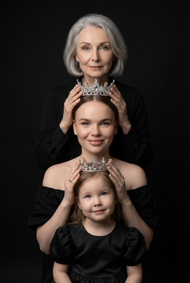 У каждой на голове корона, которую предыдущая женщина держит руками. Все смотрят в камеру с нежным выражением лица, с лёгкой улыбкой .Освещение мягкое, акцент сделан на лицах.