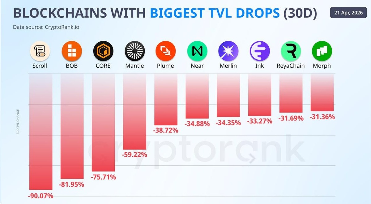 Cryptorank: блокчейны с самым сильным падением запертой стоимости (TVL) за последние 30 дней