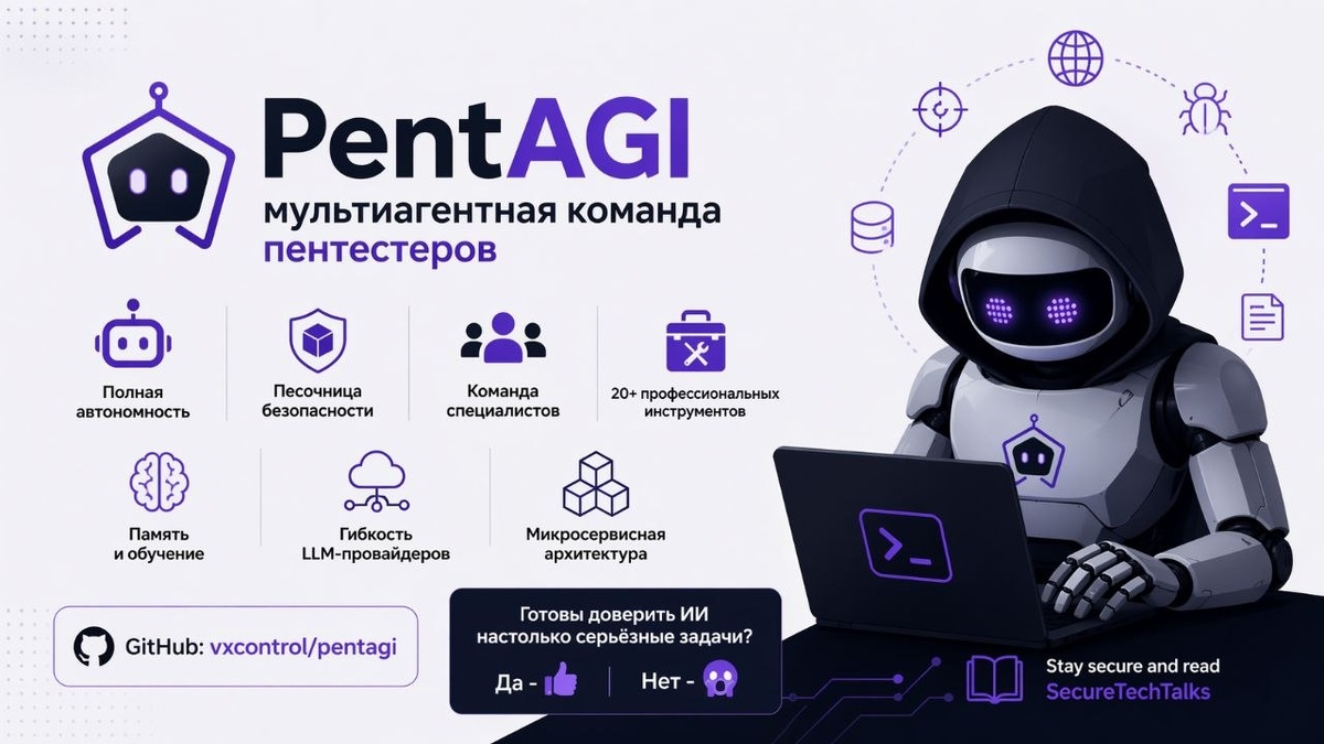 PentAGI (Penetration Testing Artificial General Intelligence) - open-source платформа, которая превращает LLM-модели в команду виртуальных специалистов по кибербезопасности. Проект позволяет автоматизировать задачи тестирования на проникновение без необходимости вручную запускать десятки инструментов. Основные фичи: 🤖 Полная автономность PentAGI сам определяет шаги тестирования: от разведки и сканирования до эксплуатации уязвимостей и генерации отчётов. AI-агенты планируют атаки, анализируют результаты и адаптируют стратегию на лету. 🏖Песочница безопасности Все операции выполняются в изолированных Docker-контейнерах. Даже если агент «сойдёт с ума» будет ущерб ограничен виртуальной средой. 👥 Команда специалистов Система использует делегирование задач между специализированными агентами: 🔍 Researcher исследует цель и собирает разведданные 💻 Developer пишет эксплойты и скрипты ⚔️ Executor выполняет атаки в изолированной среде 🧠 Adviser контролирует качество и предлагает альтер