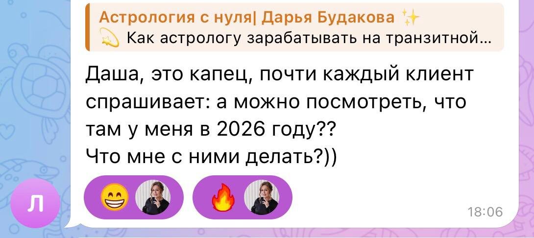 ? Вы не поверите, но когда я читаю сообщения от учеников, мне это очень откликается: Мои консультации по наталу так понравились клиентам, но потом они начали спрашивать: что меня ждёт в будущем? Можно ли сделать прогноз? Что будет дальше? И я не могу ничего ответить… Друзья, я вас очень понимаю. Когда я только обучилась натальной астрологии, клиенты уходили вдохновлённые, с инсайтами и пониманием себя. И при этом, почти сразу начинались вопросы: — можно посмотреть прогноз? — что у меня будет дальше? — когда произойдёт то, что мы обсудили? — можно ли разобрать будущее? И самое обидное — сколько клиентов и денег я теряю, потому что не могу дать людям то, что им действительно нужно. 😔 Именно поэтому я почти сразу пошла обучаться прогностике. Нельзя оставаться в точке, где умеешь разбирать натал, но не можешь ответить клиенту на вопрос о будущем. Клиентов я собрала очень быстро на первые заказы. Да, заработала немного, но это был важный этап, проверка знаний на практике и передача