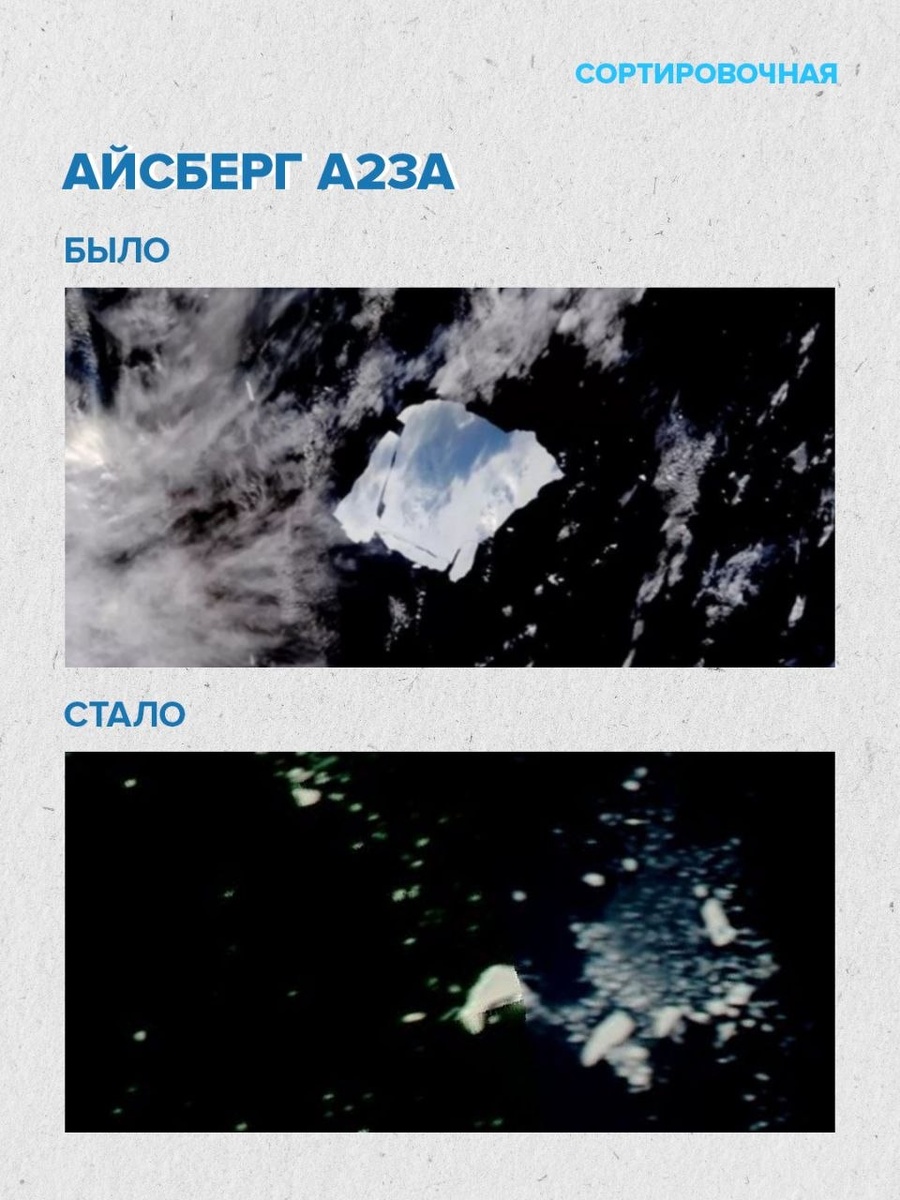 🧊💔 Разрушился крупнейший айсберг в мире, за которым наблюдали учёные последние 40 лет Айсберг А23а раскололся на мелкие части. В январе его площадь составляла около 1 300 кв.км. Теперь это менее 50 кв.км, рассказала главный специалист Центра ледовой и гидрометеорологической информации ААНИИ Полина Солощук. За последние три месяца айсберг преодолел расстояние около 1000 км, пересёк границу Южного и Атлантического океанов. Напомним, что айсберг А23а откололся от края шельфового ледника Фильхнера в 1986 году, тогда его площадь составляла 4 170 кв.км, что превышало почти в два раза площадь Санкт-Петербурга. Кадры: Арктический и антарктический НИИ Подпишись — будь на зелёной стороне | Сортировочная в MAX