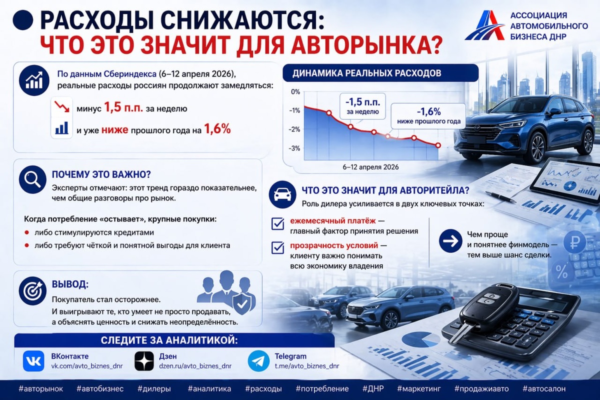 Сбериндекс в выпуске за 6–12 апреля 2026 года сообщает, что за неделю замедление реальных расходов составило 1,5 п.п., и этот показатель, таким образом, оказались ниже значения прошлого года на 1,6%. Как отмечаю эксперты, это тренд важнее «общих разговоров про рынок». Ведь когда потребление остывает, крупные покупки требуют либо кредитного импульса, либо понятной математики выгоды. Этот показатель для авторитейла это означает усиление роли платежа и прозрачности условий: клиенту проще принять решение, когда финмодель и риски владения разложены по полкам. Мы ВКонтакте Мы в Дзен Подписаться на канал Ассоциации автобизнеса ДНР