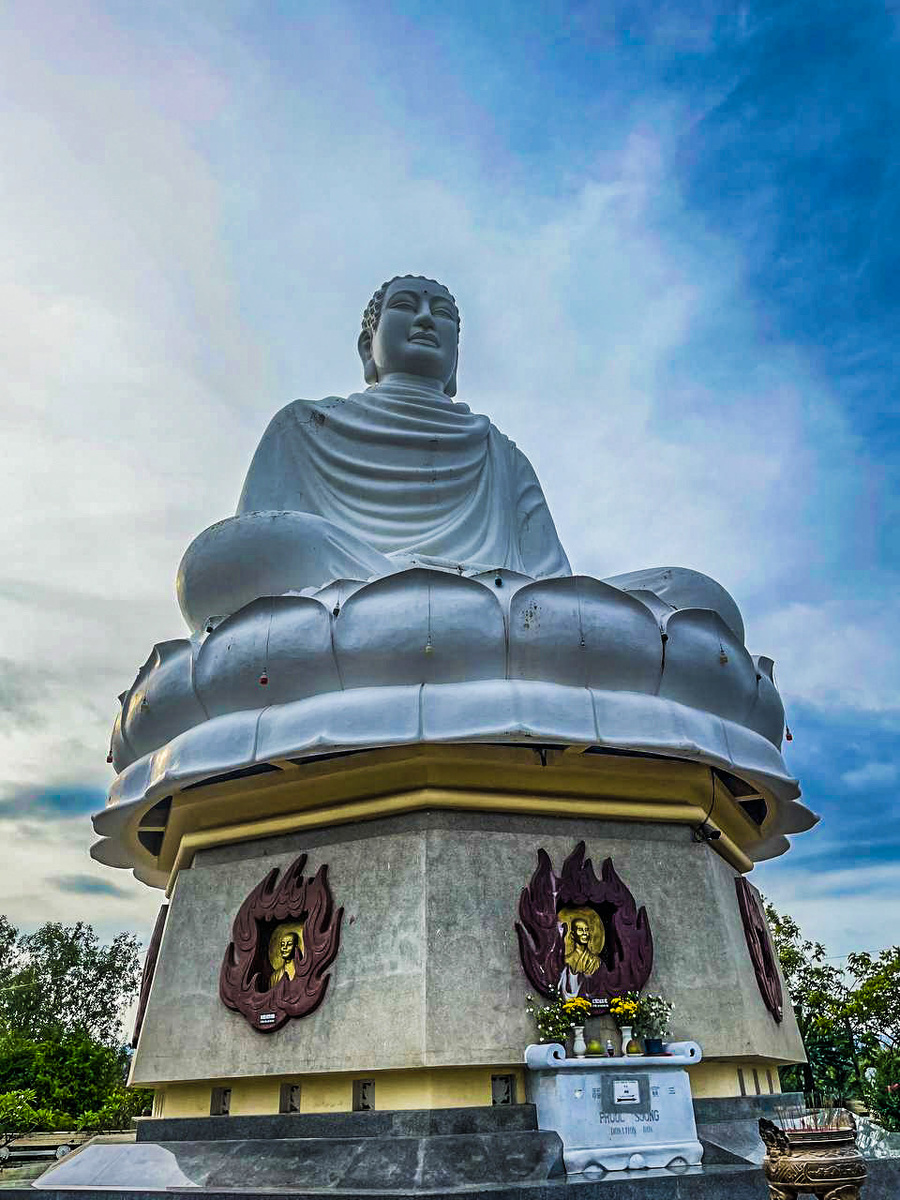И вот, преодолев последние ступени, вы видите его. 24-метровая статуя Будды Шакьямуни (Kim Than Phat To), сидящего на цветке лотоса. Это действительно самая большая статуя Будды во Вьетнаме. Он виден практически из любой точки города.
