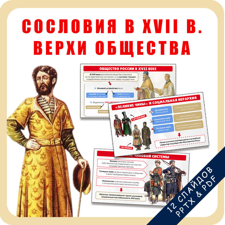 Эта презентация посвящена структуре и развитию верхних слоёв российского общества XVII века — времени укрепления сословного строя и формирования чёткой социальной иерархии. Рассматриваются особенности системы «чинов», роль служилых людей, дворянства и духовенства, а также положение групп, не входивших в чёткую сословную структуру. Содержание презентации: