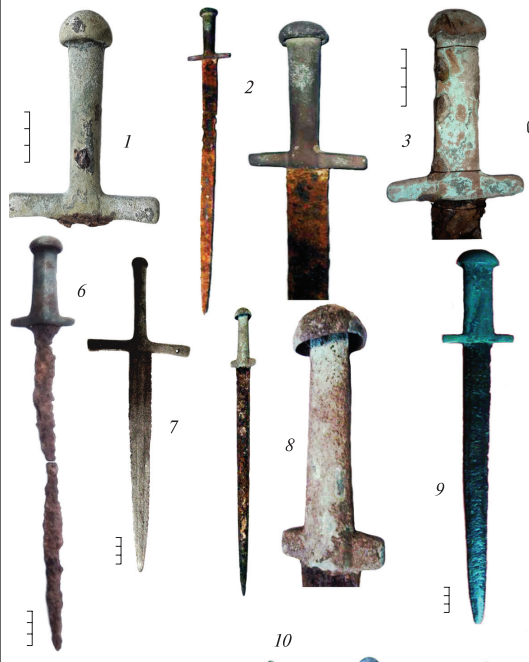 Киммерийская культура, она же протоскифская - это обобщенное название ряда археологических культур Северного Причерноморья, относящихся к очень раннему железному веку. Примерно конец IX - середина VII века до н. э. После седьмого века, как считается, уже идут скифы. Киммерийцы - крайне загадочный народ сами по себе (если, конечно, они были единым народом, а не просто группой племен, объединенных схожей культурой). И одна из загадок киммерийцев - это наличие у них длинных, около 1 метра, прямых обоюдоострых железных мечей, которых... Уже не было у "наследовавших" киммерийцам скифов. Скифская эпоха длинного меча не знает. Длинный меч возвращается в причерноморскую степь уже в сарматское время. В его истории получается странный "пробел" протяженностью около 500-700 лет... Причем киммерийский меч - уже весьма совершенный по форме. У него есть развитый эфес с правильной, удобной гардой, удобным же задним упором и рукоятью, которая не будет скользить в руке. Таков же и киммерийский кинжал: