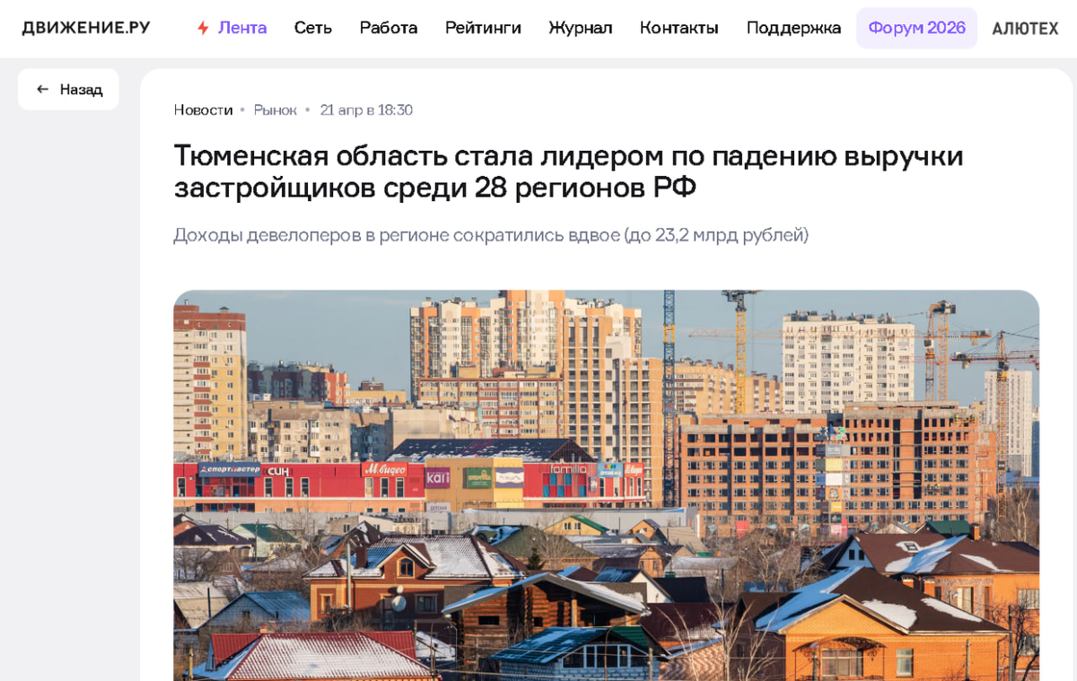 Аларм! В Тюменской области выручка девелоперов сократилась вдвое (-50,4%) по итогам I квартала 2026 года. Среди 28 регионов с крупнейшими строительными рынками, где объемы текущего строительства превышают 1 млн кв. м, это самая большая просадка. Об этом сообщают аналитики Движение ру со ссылкой на данные Единой информационной системы жилищного строительства (ЕИСЖС). В топ-3 по падению выручки также вошли: Москва — продажи новостроек упали на 45,8% Ростовская область — на 45,1%. Минимальное падение зафиксировано в: Челябинской области — на 24,9% Ленинградской области — на 24,3% Приморском крае — около 15,5% Чем важна Тюменская область? Тем что это базовый регион для екатеринбургской Брусники и местной Страны Девелопмент. Обе конторы входят в ТОП-10 крупнейших в России. Так что обвал в Тюмени, это удар в первую очередь по крупняку. Сорри, забыл, - нет никакого обвала, а есть «временная коррекция после перегрева». Ведущий стратег СберИнвестиций г-н Макаров не даст соврать. Хотя может и с