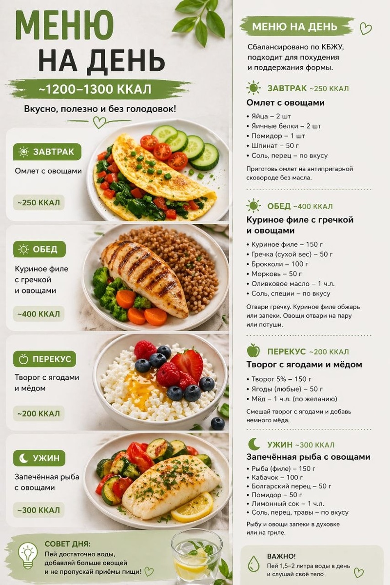 Сбалансировано, сытно и без голодовок 💚 Отлично подойдёт для похудения 🍳 Завтрак (~250 ккал) Омлет с овощами 🍲 Обед (~400 ккал) Куриное филе + гречка + овощи 🥑 Перекус (~200 ккал) Творог с ягодами и мёдом 🍗 Ужин (~300 ккал) Запечённая рыба с овощами 💡 Совет дня: Пей больше воды и не пропускай приёмы пищи Сохрани, чтобы не потерять ✔ #меню