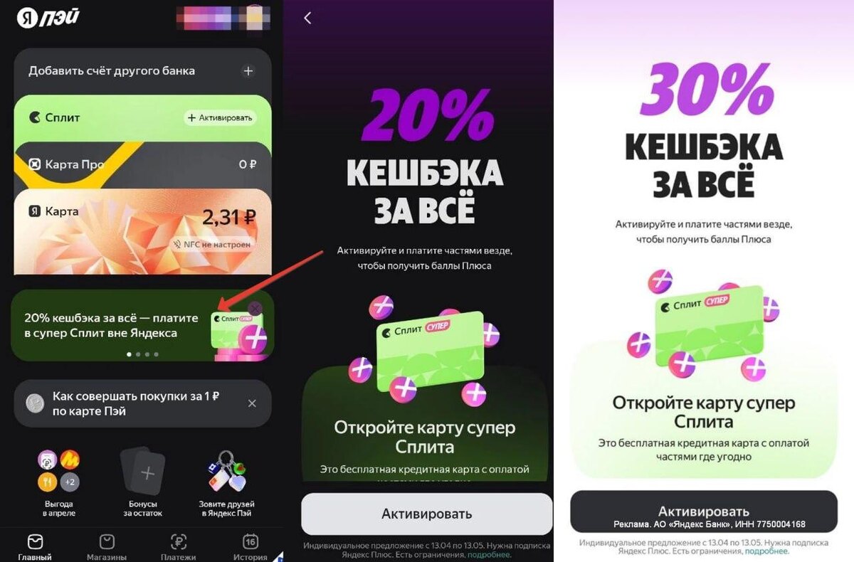 Яндекс: персоналки по Супер Сплиту В приложении Яндекс Пэй опять персонально предлагают кэшбэк до 30% на всё за карту Супер Сплита. Акция действует до 13.05.26, лимиты разные (1000-2000 баллов) – ищите у себя. Напомним, карта позволяет оплачивать покупки частями и делить оплату на срок 2-24 мес (на первую покупку до 30к дают 6 мес без переплат), срок выбирается на экране карты до покупки. ➕ Для начисления и траты баллов Плюса 1к1 в сервисах Яндекса нужна подписка Яндекс Плюс 👛 Как забрать еще до 2 500 баллов от Яндекса (1 балл = 1 ₽): 1. Карта Супер Сплита: +1000 баллов Позволяет разбивать оплату покупок на срок до 24 месяцев (до 6 месяцев — вообще без переплат). За оформление тоже накинут 1000 баллов Плюса. ✅ Оформить Супер Сплит и забрать 1000 баллов 💳 2. Дебетовка Яндекс Пэй: 5% кэшбэка на ВСЁ У кого еще нет карты — по спецссылке дают 5% кэшбэка на любые покупки в первые 30 дней (максимум 1 000 баллов). Плюс остаются ежемесячные категории на выбор и барабан кэшбэка по понеде