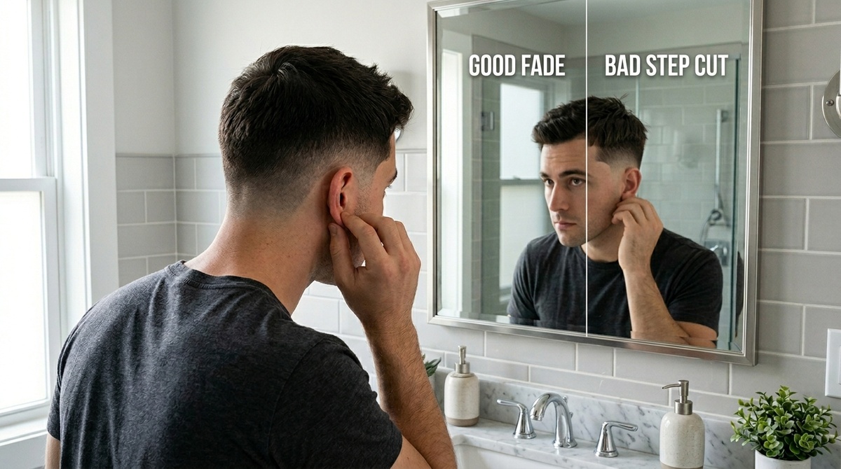 Я ориентируюсь на три зоны: виски, за ухом и шея. Если от уха к макушке есть мягкий градиент, а окантовка тонкая и чистая — это фейд. Если же по кругу головы идёт ровная полоса одной длины, это просто стрижка машинкой.