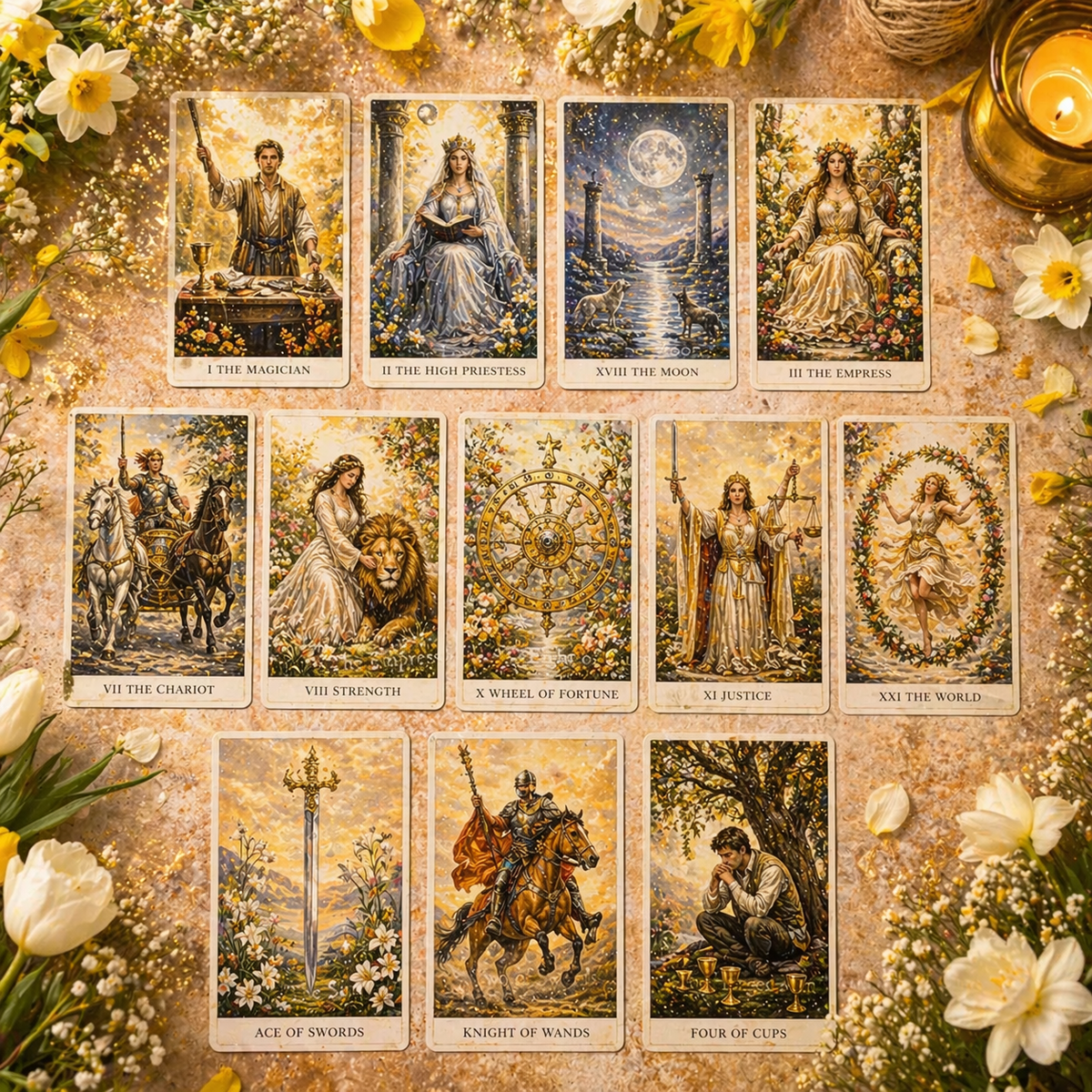 Самое важное в этом раскладе — это не то, что уходит, а то, что приходит. И здесь карты дают очень чёткий ответ: начинается период реального движения и наполнения. В вашу жизнь входит не просто шанс, а серия возможностей, которые будут требовать от вас решения. Это может быть предложение в работе, которое откроет новые перспективы, может быть знакомство, которое изменит эмоциональный фон вашей жизни, может быть дорога, которая выведет вас в совершенно другое пространство. Причём эти события не будут случайными или хаотичными — они будут логичным продолжением той внутренней трансформации, которая уже произошла. Очень ярко идёт тема выбора, и здесь важно понимать: вы больше не в позиции, где выбирают вас, вы в позиции, где выбираете вы. Это принципиальное изменение роли. Вы начинаете определять, что подходит, а что нет, что принимать, а от чего отказываться. И именно это создаёт ощущение власти над собственной жизнью, о котором вы могли раньше только думать. В раскладе также идёт линия любви, но она уже не связана с болью и разочарованием, а с притяжением, где есть уважение и желание быть рядом. Параллельно открывается финансовая и жизненная стабильность, которая приходит не через усилие «на износ», а через правильное распределение энергии. Итог этого пророчества — возвращение себя, своей силы, своего пути и своего будущего. И самое главное — это уже не перспектива, а процесс, который начался и будет только усиливаться.