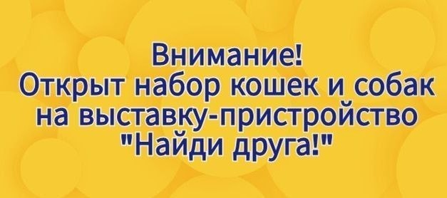 Москва. Московская область. Организатор выставок «Найди друга». Центр защиты животных АНО «ГБР.Зоозащита» открывает набор кошек и собак на выставку-пристройство «Найди друга». 🔷Выставка будет проходить 25 апреля, с 12 до 19 часов, в ТРЦ Авеню Север по адресу: Москва, Коровинское ш. 2 1 минута от метро 🚇 Селигерская Не верно заполненные заявки рассмотрены не будут! Если ответ не поступил, значит заявка не одобрена. Кураторы привозят свои клетки для кошек! Собачки рассматриваются до 45 см в холке. Количество мест ограничено! Заявки принимаются на почту gbr.findfriend@ya.ru. 1 животное - 1 письмо В теме письма: Выставка 25 апреля кошка/собака «кличка» В самом письме: 1. ФИО, телефон куратора (телефон должен быть с приложением телеграмм и открытым номером для добавления в чат выставки) 2. Кличка кошки/собаки, возраст (не дата рождения) 3.Для кошек. Количество клеток для всех кошек которых планируете везти на выставку, те если вы подаёте заявки на нескольких животных, то указываете коли