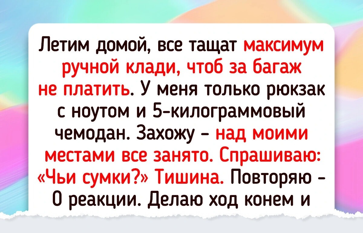 Летим домой, все тащат максимум ручной клади, чтоб за багаж не платить. У меня только рюкзак с ноутом и 5-килограммовый чемодан. Захожу — над моими местами все занято. Спрашиваю: «Чьи сумки?» Тишина. Повторяю — 0 реакции. Делаю ход конем и, cо словами «Ну раз ничьи, значит, пусть стоят в проходе», начинаю снимать сумки. Тут же визг, писк, ор, мол, не трогайте, как вы смеете! Отвечаю, что места мои, отсек надо мной предназначен для моего чемодана, пусть несут, куда хотят.