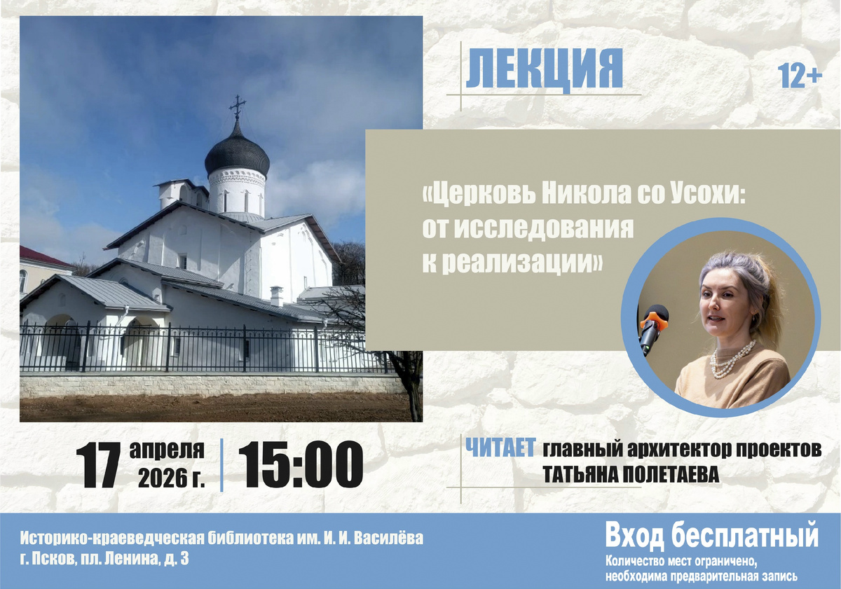 17 апреля 2026 года, в преддверии международного дня памятников и исторических мест (всемирного наследия), в Историко-краеведческой библиотеке им. И.И. Василёва состоялась лекция «Церковь Николы со Усохи: от исследований к реализации». О многолетних исследованиях и реставрации храма святителя Николая Чудотворца (со Усохи) рассказала главный архитектор ООО «Псковский институт Спецпроектреставрация» Татьяна Полетаева. Слушатели узнали о том, как современные технологии помогают раскрыть тайны древних мастеров и сохранить историческое наследие для будущих поколений. Смотрите запись лекции на нашем сайте: https://pskov-eparhia.ru/archives/100758