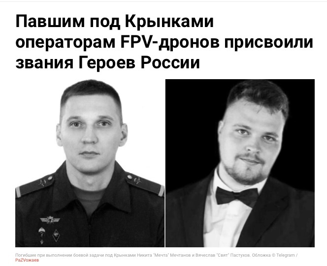 - Губернатор Севастополя Михаил Развожаев сообщил, что военнослужащим-операторам FPV-дронов Никите Григорьевичу Мечтанову и Вячеславу Александровичу Пастухову указом президента присвоены звания Героев России посмертно. Они погибли 30 октября 2023 года в бою под Крынками. Российские дроноводы впервые получили такие высокие награды.