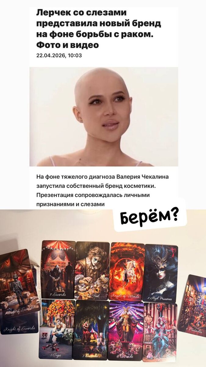… Сочувствую Лере, которой бы с семьей побольше побыть, да в единении со своим настрадавшимся организмом. Но после четвертого ребенка, Лера родила-таки новый бренд косметики🤷♀️ поговорим про «нового ребеночка». Новый, да не совсем (Шут, 7 мечей), — бренд спешили выпустить, так что возможно, это возвращение к прошлому, ныне забытому Letique. В раскладе много карт мечей, а значит сильно спешили, очевидно, у Леры какие-то обязательства перед людьми (5 кубков, 3 мечей), а состояние, сами понимаете. Еще год назад мама Чекалиной распродавала гардероб дочери, чтобы «выжить», а сейчас на ней числится «новый косметический бренд». Это так к слову и ко всем картам обмана в раскладе (3, 7, паж мечей). Мой вывод: за спиной не совсем искренне плачущей Чекалиной, презентующей «это всё, что останется после меня» EYYA SKIN, стоят другие люди, но не мать (Верховная жрица). Рекламной кампании нового бренда очень кстати такие «чувственные» речи. Цинично? Да, но это жизнь. А косметика, кстати, неплоха