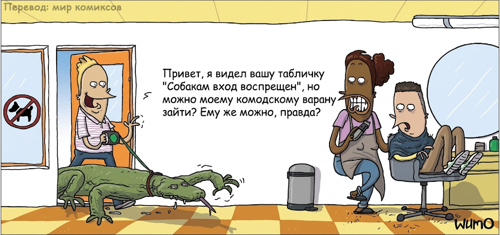 Но именно такая немного гротескная подача отлично контрастирует с холодным, рассудочным и невероятно острым текстом. Рисунок говорит сам за себя: мимика героев, их позы и тщательно подобранные мелкие детали на заднем плане передают всю комичность ситуации еще до того, как вы прочитаете реплику.