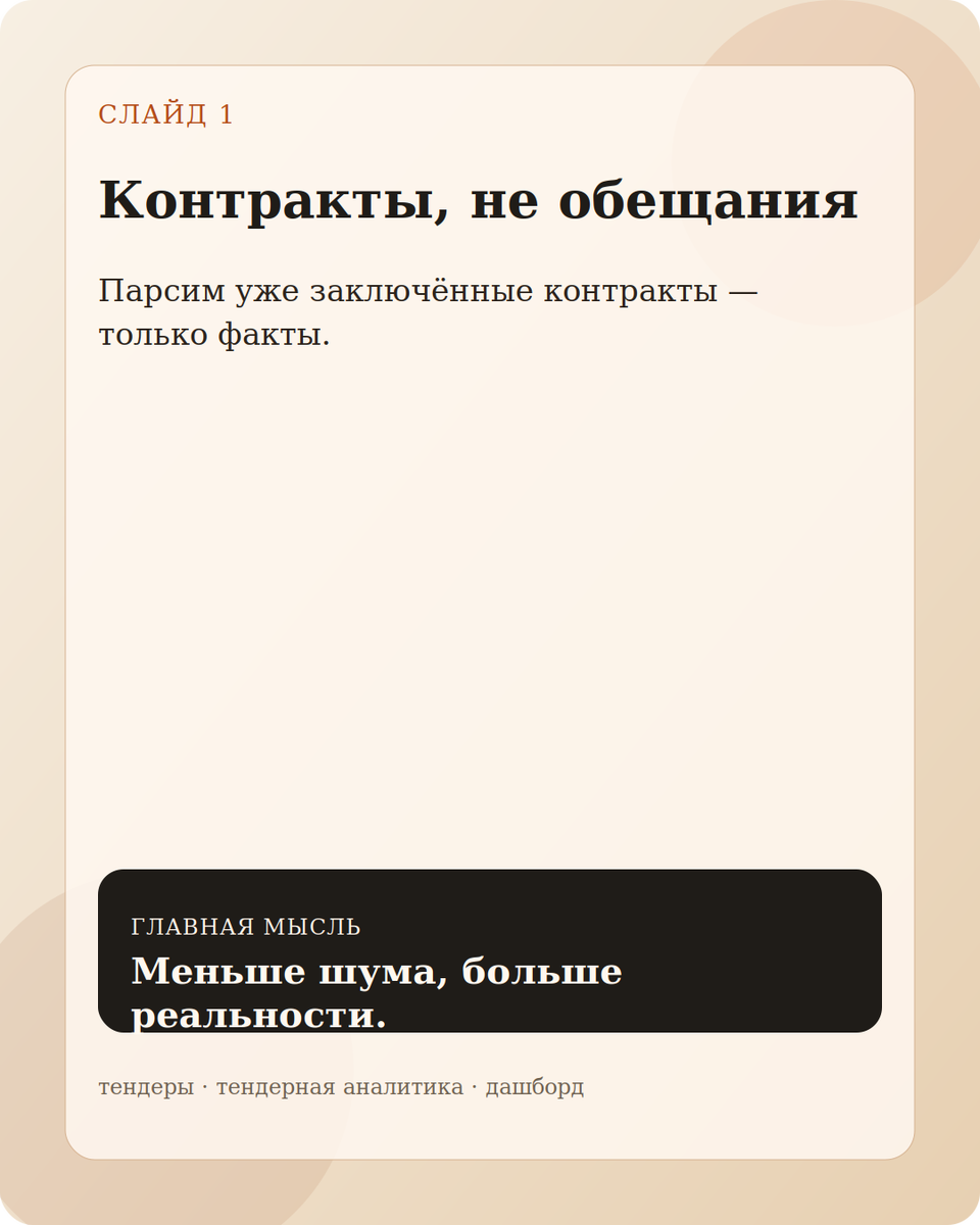 Dzen Как парсинг контрактов и нормализация данных превращаются в понятный рейтинг товара Когда речь о тендерах, важнее не объём данных, а их сопоставимость. Поэтому я начал с парсинга уже заключённых контрактов: это факты, а не обещания. Из каждого контракта вытягиваются товары, регионы, кварталы и поставщики. Следующий шаг — нормализация данных: приводим к единым группам и единицам измерения, считаем уверенность распознавания. Пусть это не идеально с первого дня, но уже работает и даёт картину рынка. Результат — дашборд. В нём фильтры по кварталам, регионам и группам. Есть рейтинг товара от 0 до 10 — оценка конкурентности и интересности позиции. Плюс видна доля главного поставщика и тип продаж (одиночно или в наборах). Зачем это всё? Чтобы за минуту понять, куда идти в тендеры, а где лучше подождать. Когда в карточке товара видно суммы по кварталам, минимальную цену, стабильность и разнообразие поставщиков, решение принимается быстрее. Начинайте с малого. В моём MVP — 5498 нормализова