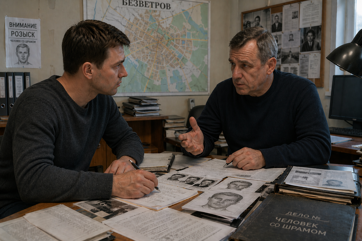 – А может быть, в Безветрове постоянно живет не тот, высокий, со шрамом, а как раз тот, другой – низенький, которого никто никогда не видел без балаклавы? – выдвинул неожиданную гипотезу Петровский. – А высокий, заметный, со шрамом, обитает где-нибудь поблизости, в окрестных деревнях, или даже в самом областном центре, и приезжает сюда только на дело, в дни налетов? Впрочем, мы ведь даже не знаем толком, как выглядит этот злополучный шрам. В своих показаниях пострадавшие люди говорят просто о «шраме над левым глазом» – и всё. Но какова точная форма этой метки, какой она длины и ширины, нигде не упоминалось ни разу, ни в одном протоколе. Не говоря уже о том, что расстояние от глаза до линии роста волос на лбу у разных людей разное, порой довольно значительное. Шрам может располагаться вплотную над самым глазом, а может и гораздо выше, почти у границы волос, и тогда его вполне успешно прикроет прядь, спадающая на лоб, или глубоко надвинутый головной убор.