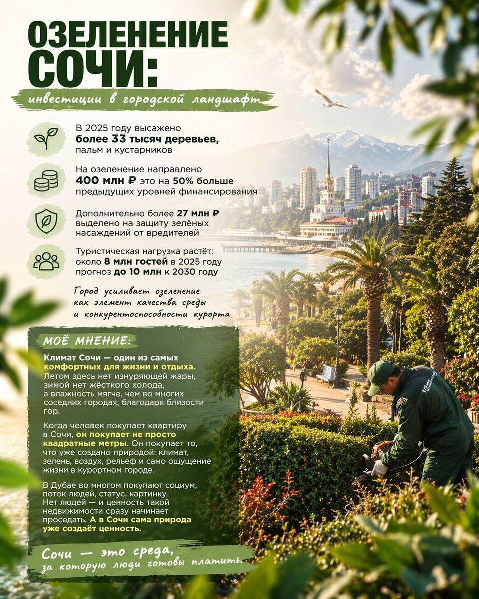В 2025 году в городе высадили больше 33 тысяч деревьев, пальм и кустарников 🌳🌿. На озеленение направили 400 млн ₽ 💰. Это на 50% больше, чем раньше 📈. Ещё 27 млн ₽ — на защиту растений от вредителей 🛡️🐛. То есть город уже не просто что-то высаживает для отчёта. Город вкладывается в среду 🏙️💚. И всё это на фоне роста турпотока: около 8 млн гостей в 2025 году 🧳✈️ и прогноз до 10 млн к 2030 году 🔮. Сочи усиливают не только стройкой 🏗️. Сочи усиливают тем, в чём его настоящая ценность ✨. Потому что климат Сочи — один из самых комфортных для жизни и отдыха ☀️🌊. Летом нет такой тяжёлой жары, как во многих южных странах 🌡️. Зимой нет жёсткого холода ❄️. Влажность мягче, чем во многих соседних городах, за счёт близости гор ⛰️💧. Поэтому, когда человек покупает квартиру в Сочи 🏠, он покупает не просто стены. Он покупает то, что уже создано природой 🌍: мягкий климат 🌤️ зелень 🌲 воздух 💨 рельеф 🏔️ само ощущение жизни в курортном городе 🏖️ В этом и разница ⚖️. В Дубае п