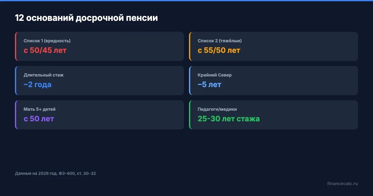 В 2026 году общий пенсионный возраст — 64 года для мужчин (1962 г.р.) и 59 лет для женщин (1967 г.р.). С 2028 года реформа завершится: 65 и 60 лет. Но ФЗ-400 «О страховых пенсиях», статьи 30–32, перечисляет конкретные основания, по которым пенсия назначается раньше.