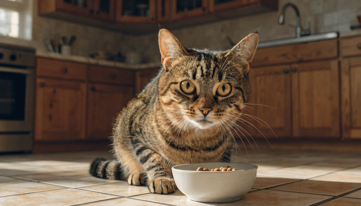 Кошка на дешёвом корме, которую кормят два раза в день строго по порции — получает дозированное питание без перегрузки. Организм успевает переработать еду полностью. Нет постоянной стимуляции пищеварения, нет хронического переедания. Это банально, но это работает — и влияет на здоровье не меньше, чем сам состав.