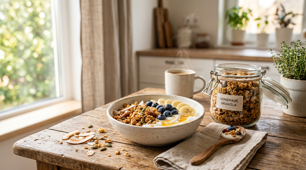 Домашняя гранола с тыквенными семечками и кокосовой стружкой стала для меня не просто завтраком, а чем-то вроде маленького кухонного ритуала. Раз в две недели я нахожу спокойный вечер, включаю музыку, достаю все ингредиенты и неторопливо готовлю новую партию. Пока она запекается, по квартире плывёт тёплый сладковатый аромат, от которого сразу становится уютно. А потом две недели я каждое утро достаю банку, насыпаю порцию, заливаю чем-нибудь вкусным и начинаю день с ощущением, что всё идёт как надо.
