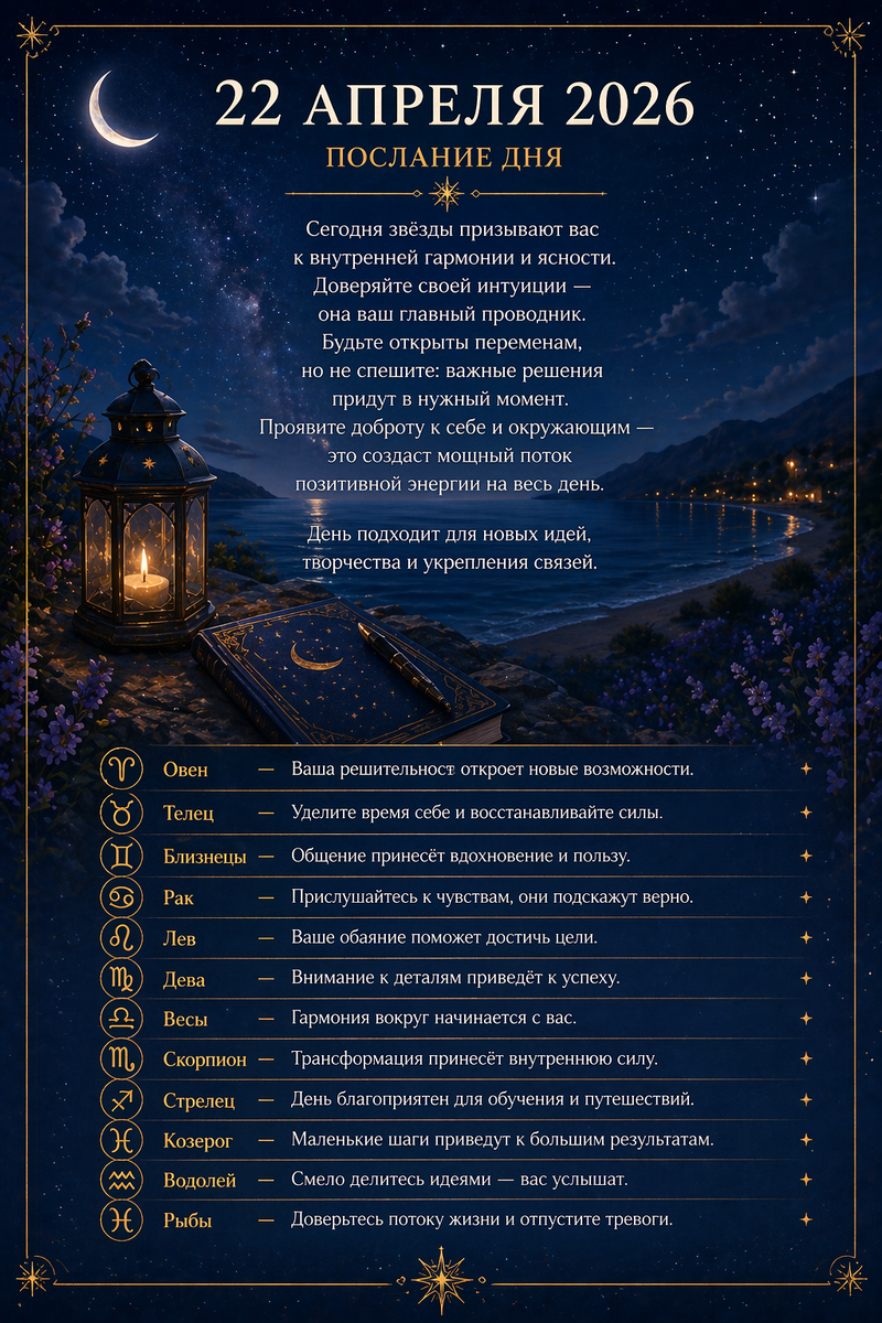 Послание дня: 22 апреля 2026 — день внутренней устойчивости, осознанных решений и тихой силы. Сегодня лучше не спешить, а идти уверенно и внимательно. Всё важное раскроется через спокойствие, наблюдательность и доверие к своему пути. Овен — день требует собранности. Чем спокойнее ты действуешь, тем сильнее будет результат. Телец — хорошее время для практичных решений, покупок, работы и укрепления своих позиций. Близнецы — сегодня многое решит разговор. Одно вовремя сказанное слово может многое изменить. Рак — позаботься о своём внутреннем состоянии. Тишина и отдых дадут тебе больше, чем суета. Лев — день помогает проявиться в деле, которое тебе действительно важно. Не бойся брать инициативу. Дева — внимание к мелочам станет твоим преимуществом. Сегодня детали особенно важны. Весы — ищи красоту и гармонию даже в мелочах. Это поможет сохранить силы и ясность. Скорпион — день подталкивает к внутреннему обновлению. Оставь то, что больше не работает. Стрелец — полезно думать шире обычного.