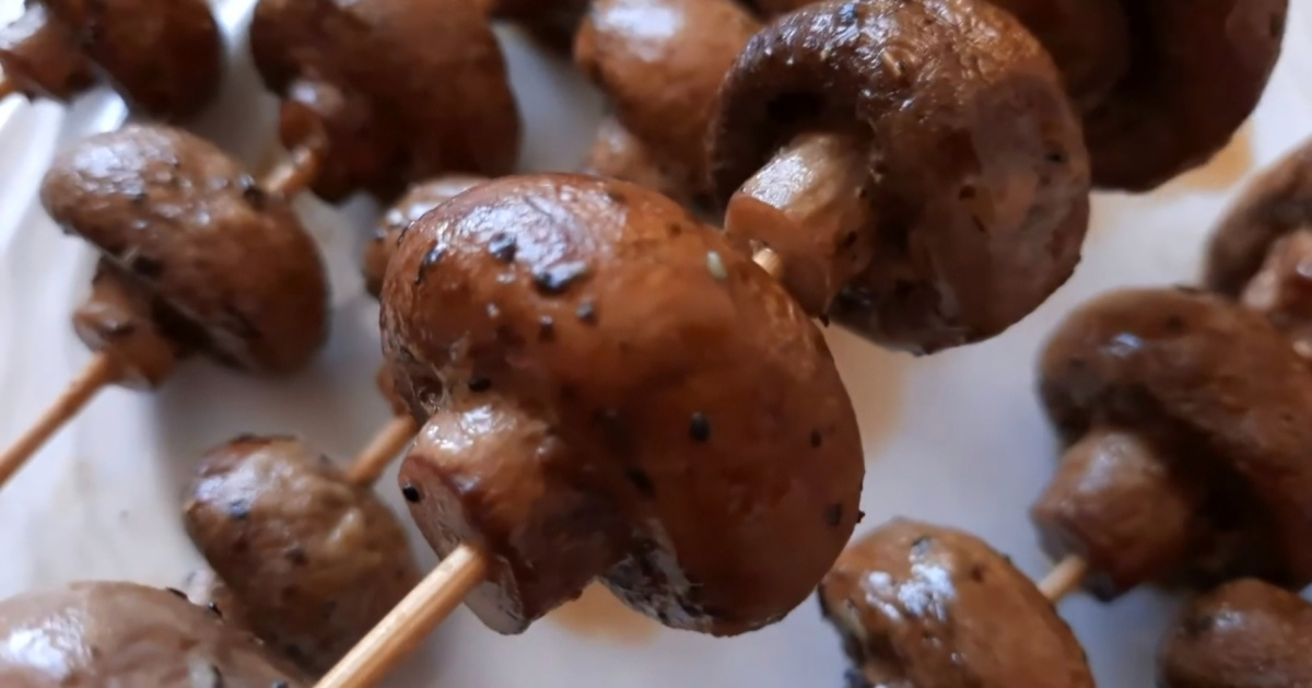 5. Спустя час нанизываем шампиньоны на деревянные шпажки (если деревянные — предварительно замочите их в воде на 10 минут, чтобы не сгорели).