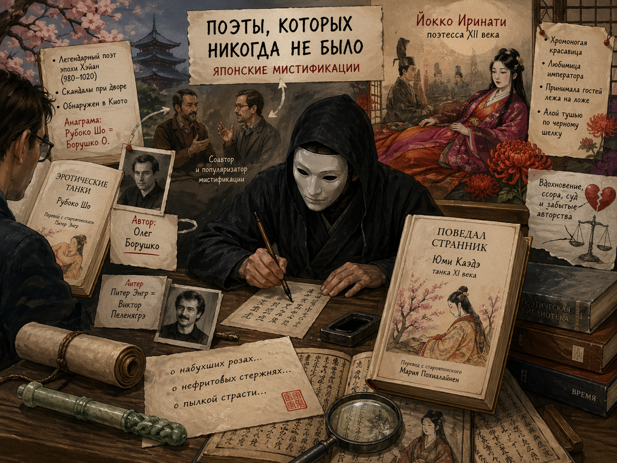 За последние десятилетия отечественные читатели открыли для себя массу древних японских поэтов и поэтесс. Книжные полки магазинов до сих пор ломятся от сборников древних танка и хайку, а в пабликах вовсю цитируются строчки про какие-нибудь хризантемы в серебряной росе и тоску императора по прекрасной наложнице. Есть только одна маленькая проблема. Часть этих древних поэтов... никогда не существовала. Их придумали. От начала и до конца. Имена, подробности биографии, стихи - все. Самые талантливые из этих мистификаций обманывали читателей годами, а некоторые - до сих пор кочуют по сборникам как подлинные шедевры восточной лирики. В смутные времена ранних девяностых, когда будущее страны было туманно, как утро в Эдо, на свет появился сборник "Эротические танки". На обложке значилось: Рубоко Шо. Внутри пояснялось, что это легендарный поэт эпохи Хэйан, живший в 980 – 1020 гг. Его стихи о любви и страсти вызывали скандалы при императорском дворе. Перевод со старояпонского выполнил некий Пите