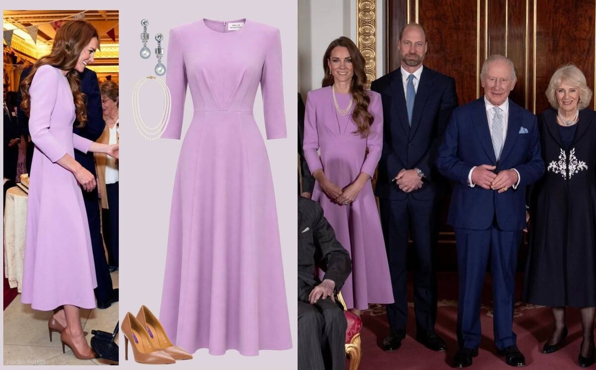 21 апреля 2026 года Кэтрин, принцесса Уэльская, вошла в Мраморный зал Букингемского дворца в платье цвета лаванды и жемчуге, принадлежавшем королеве. Повод: столетие Елизаветы II. Не годовщина смерти, а день рождения. И это важно, потому что именно этот нюанс определил весь образ. Платье сшито в ателье Emilia Wickstead на заказ. Вещи этого бренда имеют особую архитектуру и качество ткани. Креп не мнётся и не обвисает, силуэты не устаревают, потому что никогда особо не следуют трендам. Рукав три четверти, округлый вырез, длина миди: всё выверено до миллиметра и при этом выглядит естественно, словно так и должно быть. Лавандовый оттенок здесь не случаен. Елизавета II десятилетиями появлялась в этом цвете на ключевых событиях: юбилейных визитах, Royal Ascot, государственных церемониях. Мягкая сирень стала частью её личной хроматики, почти фирменным знаком. Выбрав именно этот оттенок, принцесса не цитировала стиль королевы, она продолжала разговор с ней, на том же языке. Украшения идеаль