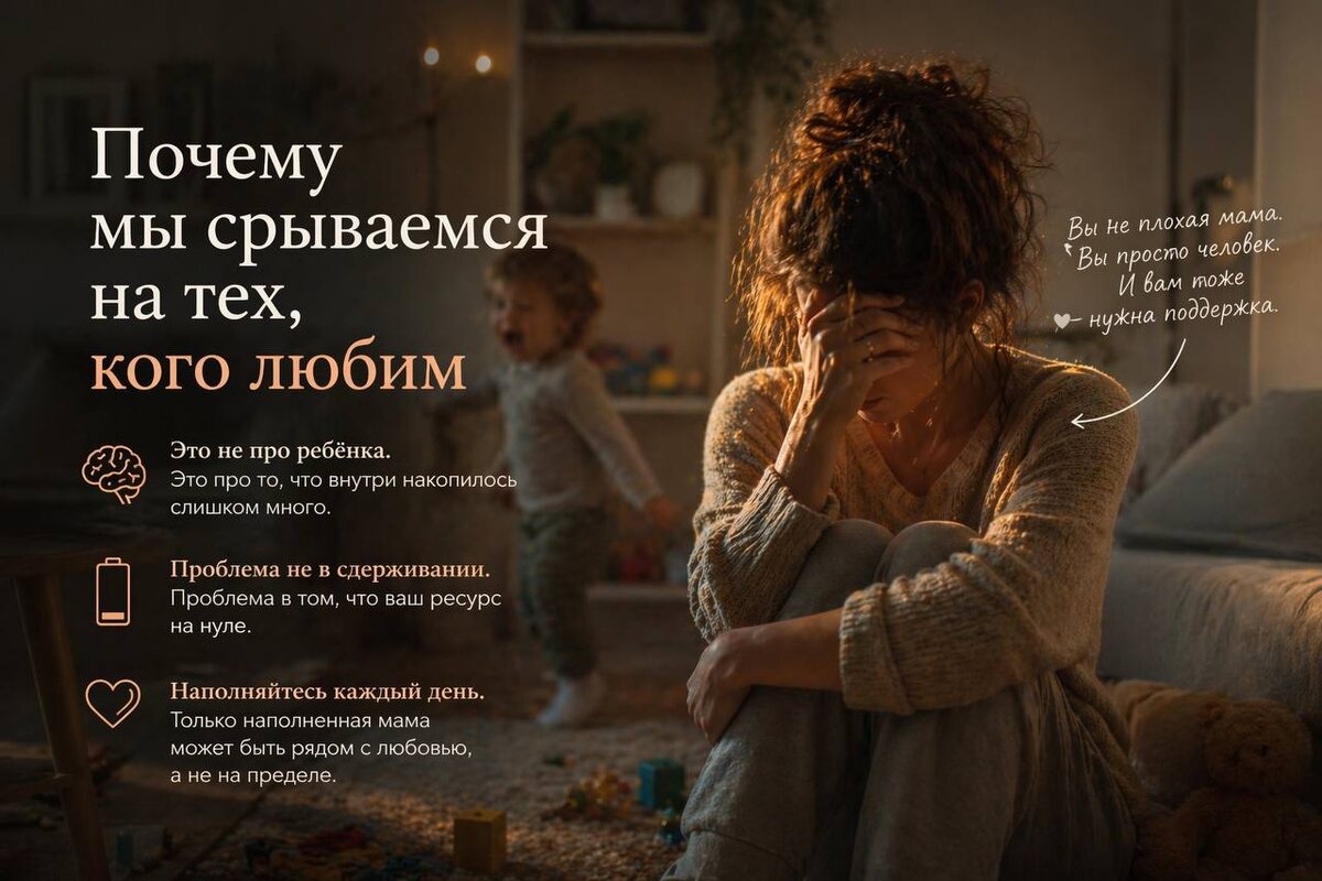 Вы срываетесь на детей. А потом ненавидите себя за это. И дело не в том, что вы плохая мать. Дело в том, что ваш внутренний контейнер давно переполнен — и выплёскивается туда, где безопаснее всего. Туда, где вас точно не отвергнут и не уйдут. Вот как это устроено изнутри. Срыв на ребёнка — это почти никогда не про ребёнка. Это про то, что внутри накопилось слишком много. Усталость, которой некуда деться. Злость, которую нельзя выразить там, где она возникла. Тревога, которая ищет хоть какой-то выход. И ребёнок оказывается рядом. В самый неподходящий момент. С разлитым соком или очередным «мама, мама, мама». Он ни при чём — просто оказался рядом. Вы срываетесь. Потом накрывает вина. Вы держитесь, стараетесь, терпите. Снова накапливаете. И круг повторяется — потому что ничего по сути не меняется. Проблема не в том, что вы не умеете сдерживаться. Проблема в том, что сдерживать уже нечем. Ресурс на нуле. А пустой сосуд не может никого наполнить — сколько бы он ни старался. Что с эти