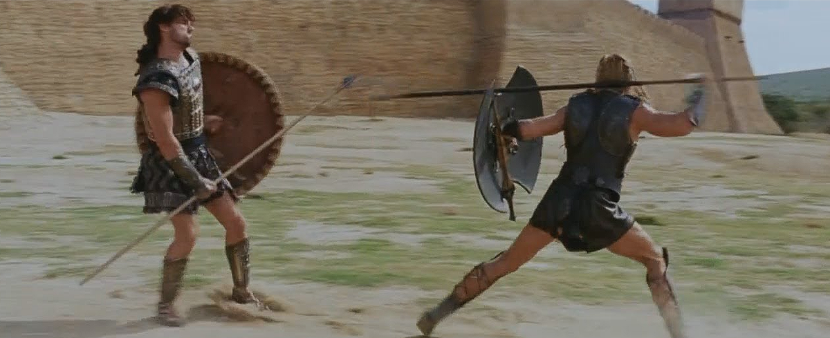 И снова вернемся к Ахиллесу. Перед решающей фазой поединка с Гектором он картинно отбрасывает свой целый, неповрежденный щит в сторону, чтобы продемонстрировать свою крутость и продолжить бой одним мечом (или копьем). Этот троп "отбросить щит ради ярости" эксплуатируется в каждом втором историческом боевике.