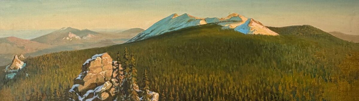 38х100 холст/масло 2026 ••• Панорама «Нургуш» раскрывается медленно и спокойно. Горы намечены светом и уходят в мягкую дымку, лес занимает почти всю картину. Глаз не цепляется за детали, он словно отдыхает, скользит по поверхности. В этом есть особое состояние — перестаешь искать главное и просто смотришь. «Нургуш» продолжает традицию русского пейзажа, где сила природы раскрывается в сдержанности, ясности построения и торжественности перед лицом большого ландшафта. ••• Испытать на себе гипнотическую мощь тайги можно на выставке «Тайга — закон, медведь — хозяин» в галерее YOLKA art до 10 мая 2026 года. ••• Москва, Ходынский бульвар, 20а ежедневно с 11:00 до 21:00 Вход свободный, работы доступны к покупке. Контактная информация — на сайте YOLKA.art.