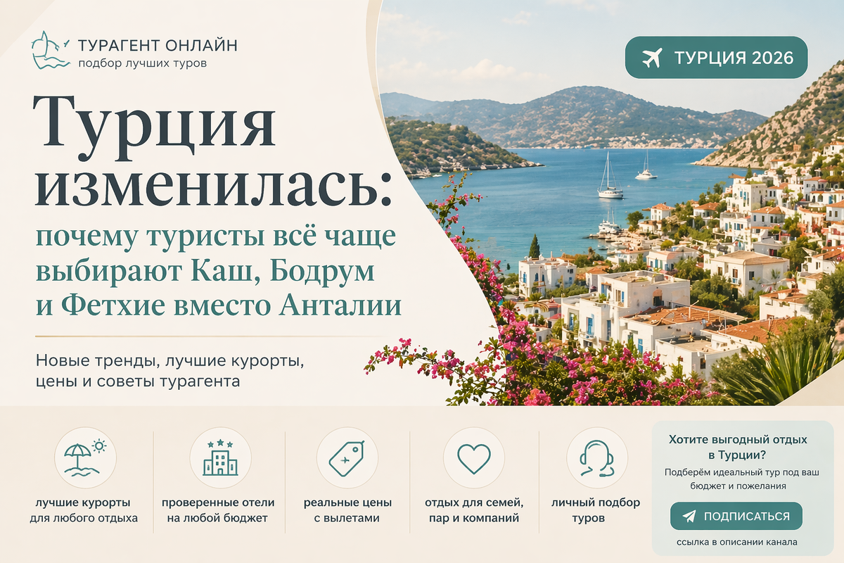 Но в 2026 году ситуация заметно меняется. Всё больше путешественников выбирают Каш, Бодрум, Фетхие, Мармарис и другие курорты Турции, а Анталия перестаёт быть единственным очевидным вариантом.