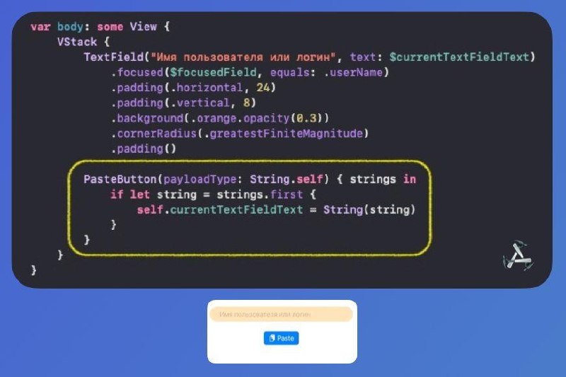 () PasteButton - это стандартный элемент SwiftUI, который берет данные из буфера обмена и передаёт их в замыкание, которое выполняется при нажатии PasteButton Если короче: это кнопка, которая вставит текст из буфера обмена в ваше приложение: PasteButton имеет стандартный дизайн, которому вы можете изменять цвет и окантовку. Если нужен свой собственный, то UIPasteboard.general.string - это буфер обмена А в нашей статье про TextField мы рассмотрели всё, что касается элемента TextField: варианты инициализации, дизайн, модификаторы, лайфхаки, SecureField и многое другое!