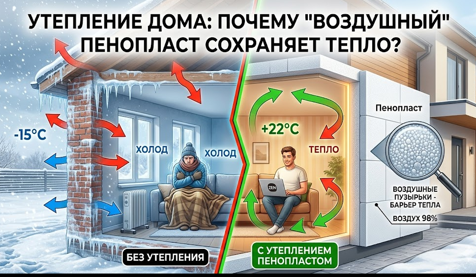 Когда обыватель приходит на строительный рынок, у него разбегаются глаза. Минеральная вата, стекловата, напыляемый полиуретан, экструдированный пенополистирол и старый добрый, дешевый белый пенопласт. Берешь лист пенопласта в руки — а он почти ничего не весит. Кажется хрупким, ненадежным. Возникает логичный вопрос: как эта невесомая белая плита, которая крошится в руках, может остановить суровую русскую зиму лучше, чем метровая кирпичная стена?