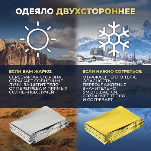 😉👍👍 Спасательное одеяло (термическое покрывало) — это сверхлегкое и компактное полотно из металлизированной пленки (лавсана/майлара), предназначенное для защиты тела от переохлаждения или перегрева. Оно отражает тепло, сохраняя температуру тела, и используется в экстренных ситуациях, походах и в аптечках. Основные синонимы: Космическое одеяло. Термоодеяло / Термопокрывало. Изофолия / Изотермическое покрывало. Майларовое одеяло. Одеяло из фольги. Способы применения: Защита от холода: Завернитесь в одеяло серебристой стороной внутрь, чтобы сохранить тепло тела. Защита от жары/перегрева: Укройтесь серебристой стороной наружу, чтобы отразить солнечные лучи. Создание укрытия: Используйте как тент или подстилку для защиты от ветра и влаги. Сигнализация: Блестящая поверхность хорошо видна с воздуха для спасателей. Отражение тепла костра: Повесьте одеяло за спиной (со стороны лагеря), чтобы усилить тепло от костра. Как работает: Одеяло весом всего 40-60 г способно сохран