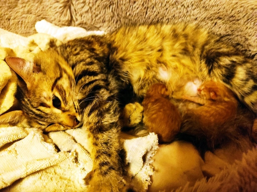 Из молодой озорной кошечки — сразу стала солидной и уважаемой матерью семейства. Рыжик, Барсик, Малышка и Черепашка. Так мы предварительно назвали котяток.