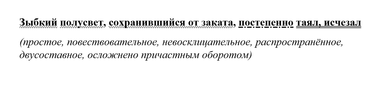 (1)Вечерело. (2)Лес тянулся на много вёрст вокруг нас, молчаливый и темнеющий. (3)Этот лесной край, казалось, был погружён в спокойное молчание ночи, медленно приближающейся. (4) Утомлённые долгой вечерней прогулкой, мы неторопливо шли по глухим тропинкам. (5) Зыбкий полусвет, сохранившийся от заката, постепенно таял, исчезал 4. (6) Надвигались стаи туч, незаметно сливаясь с темнотой. (7) Сонный воздух, напоенный пряным ароматом трав и хвои, был тёплым. (8) Светляки блестящими изумрудами то разгорались, то гасли под кустами, задрёмывающими под таинственный шёпот кузнечиков. (9)Желая сократить путь, мы повернули от озера в длинный широкий коридор вековых сосен и, конечно, уже с трудом различая в полусвете дорогу, пошли к поляне по глубокому песку и корням деревьев. (10)И вдруг с резким шуршанием в перепутанной хвое из леса вылетела преогромная птица, взвилась перед нами на широких крыльях, беззвучно описала над поляной дугу и потянула в чащу. (11)Лес мгновенно стал враждебным, строгим.